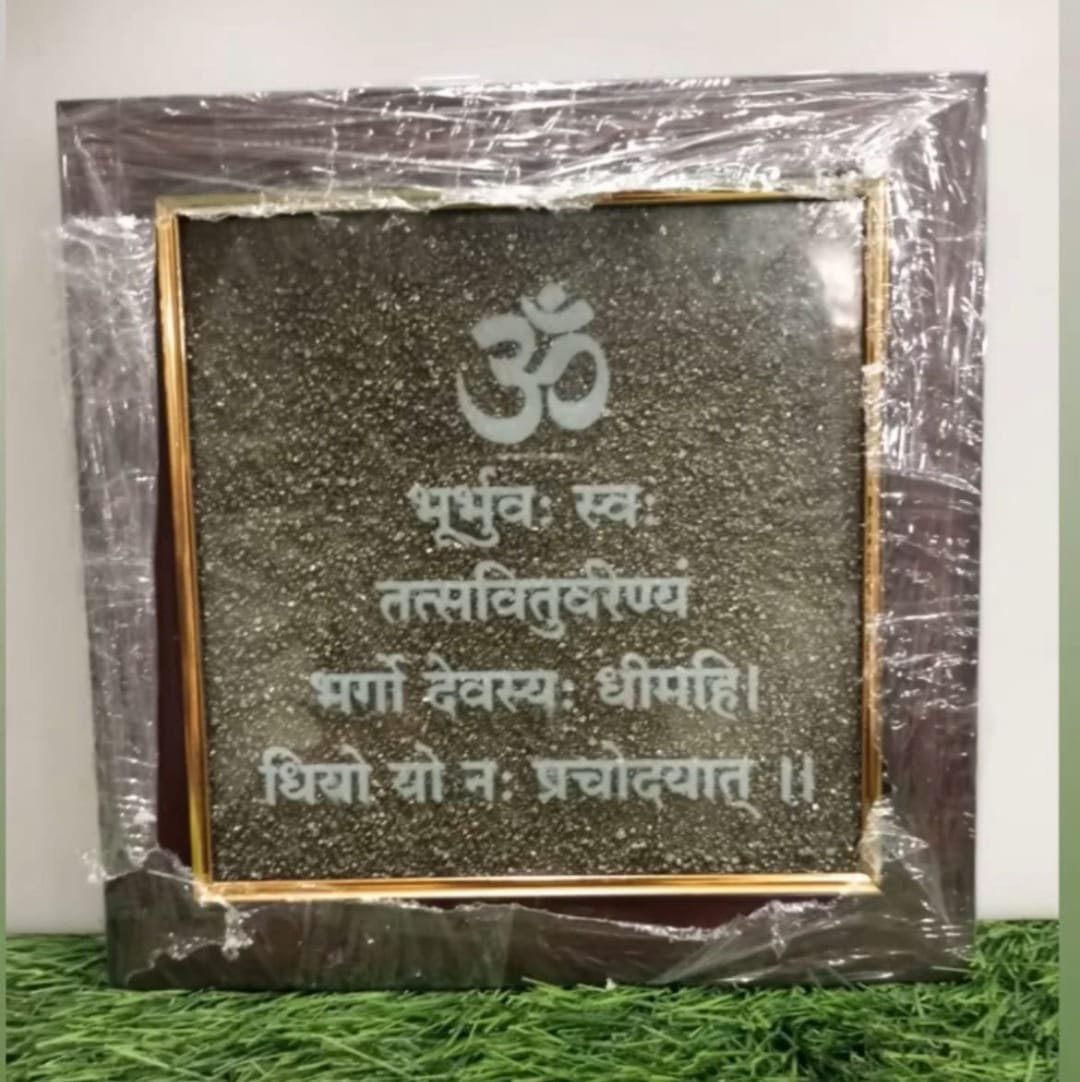 Elevate your spiritual space with this Peru Pyrite Plate Chips Frame, beautifully engraved with the sacred Gayatri Mantra. Handcrafted using genuine Pyrite chips from Peru, this frame radiates protection, prosperity, and positive energy. The shimmering metallic finish of the pyrite complements the ancient Sanskrit script, creating a striking visual and spiritual impact.